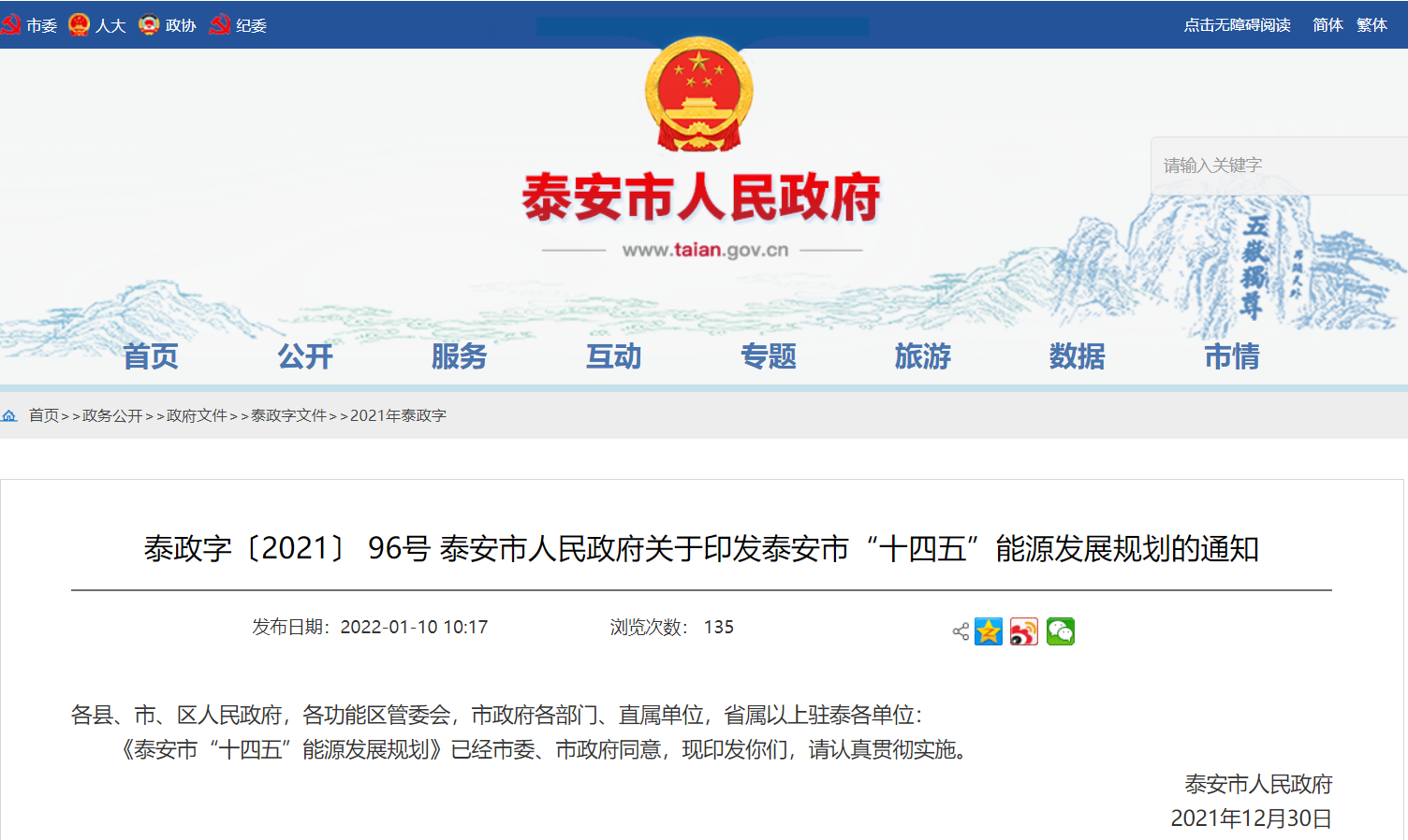 近日,山東省泰安市人民政府印發(fā)《泰安市“十四五”能源發(fā)展規(guī)劃》(以下簡稱《規(guī)劃》)。“十四五”期間,泰安市圍繞堅持“創(chuàng)新驅(qū)動、綠色低碳、效率優(yōu)先、多元互補(bǔ)、智能共享”的基本原則,加快構(gòu)建清潔低碳、安全高效的現(xiàn)代能源體系,深入推進(jìn)能源生產(chǎn)和消費(fèi)方式變革,進(jìn)一步促進(jìn)全市現(xiàn)代能源經(jīng)濟(jì)高質(zhì)量發(fā)展。