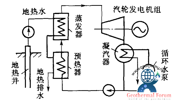 雙循環(huán)地熱發(fā)電系統是利用地下熱水來加熱某種低沸點工質,使其進入汽輪機工作的地熱發(fā)電系統,又稱中間介質法或低沸點工質循環(huán)。它是為克服閃蒸地熱發(fā)電系統的缺點而出現的一種循環(huán)系統。地下熱水用深井泵抽到地面進入電站內的蒸發(fā)器,加熱某一種低沸點介質(如氟里昂11、氯乙烷等),使之變?yōu)榈头悬c介質蒸氣,然后通入汽輪機做功發(fā)電,汽輪機排出的乏汽經凝汽器冷凝成液體,用工質泵再打回蒸發(fā)器重新加熱,循環(huán)使用。為充分利用地熱水的余熱,讓從蒸發(fā)器排出的地熱水經過一個預熱器先預熱來自凝汽器的低沸點工質液體,使其溫度上升至接近蒸發(fā)器內的工質飽和溫度,再進入蒸發(fā)器。為了保證從地熱井來的地熱水在輸送過程中不閃蒸成蒸氣和不使溶解氣體從水中逸出,在管路中的熱水始終保持超過其溫度對應的飽和壓力。