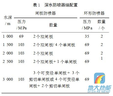 水下防噴器是海洋石油鉆采過程中用于防止井噴發(fā)生的專用設(shè)備,上部連接隔水管裝置,下部連接海底井口裝置。深水防噴器組通常有5個(gè)閘板和2個(gè)萬能防噴器組成,第5個(gè)閘板即底閘板可以剪斷套管,套管剪切閘板位于盲板的下部,以便在剪斷套管后可以關(guān)井,通常在套管可能遇卡或者鉆井裝置需要應(yīng)急脫離時(shí)會(huì)用到。2個(gè)萬能防噴器是冗余設(shè)計(jì)的需要,上部萬能防噴器作為井控的主要手段。根據(jù)水深的不同,深水防噴器組通常有不同的配置。表1是在總結(jié)Transocean公司所有不同水深典型鉆井船防噴器組配置情況得出的,可以作為深水鉆井防噴器組配置的參考。 對于浮式鉆井裝置(半潛式平臺(tái)或鉆井船),選用防噴器系統(tǒng)的通徑為?476.3mm(工作水深<600m)或?425.5mm(工作水深>600m),選用封井壓力為69、103、138MPa時(shí),視工作水深、海底至目的層深度和是否為特殊高壓的油氣層而定。為了適應(yīng)欠平衡鉆井的需要,井口防噴器組合要配置高壓旋轉(zhuǎn)防噴器,即隨鉆壓力控制系統(tǒng)PCWD(Pres2sureControlWhileDrilling)。