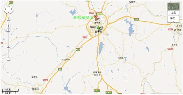 雁鳴湖溫泉位于長(zhǎng)春市西環(huán)城路與北環(huán)城路交匯處,地理坐標(biāo)為N43o56’,E125o16’。該溫泉水為淺黃色,出口溫度為40C-50℃。日流量百噸以上,富含氡、硅酸鹽、磷、溴、砷、偏硅酸、鈉、重磷酸鹽、硫酸鹽、氯化物等48種對(duì)人體有益的微量元素。