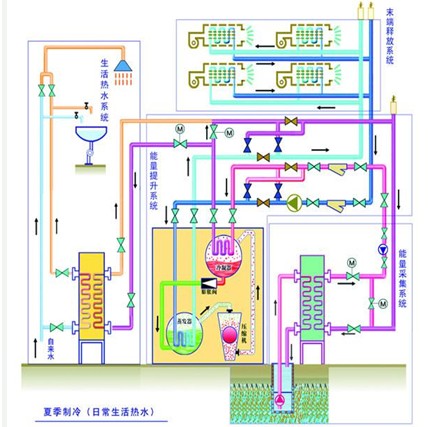 淺層地熱能即可供熱又可制冷。冬季,熱泵機組的蒸發(fā)器吸收地下土壤或水源的熱量作為熱源,通過熱泵循環(huán),由冷凝器提供熱水向建筑室內(nèi)供暖;夏季,熱泵機組的蒸發(fā)器吸收建筑物內(nèi)的熱量,到達制冷空調(diào),冷凝器通過與地下土壤或水源的熱交換,實現(xiàn)室內(nèi)制冷,同時將熱量排到地下。淺層地熱能的利用,受區(qū)域性的地下資源條件的影響較弱,可以替代傳統(tǒng)鍋爐或制冷機進行空調(diào)、采暖和供熱的模式,是改善大氣環(huán)境、節(jié)約能源的有效途徑。