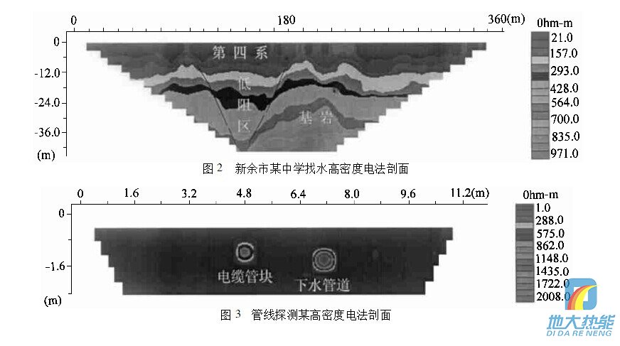 (1)高密度電法找水 新余市某鎮(zhèn)中學(xué)生活用水為淺層第四系水,秋、冬季為枯水期用水困難。據(jù)校方介紹,為解決水源問(wèn)題,多次聯(lián)系成井單位想取基巖構(gòu)造水成井,并進(jìn)行過(guò)常規(guī)電法找水工作,均未成功。我院受校方委托,為了解校區(qū)賦水構(gòu)造發(fā)育情況,采用了高密度電法開(kāi)展工作。