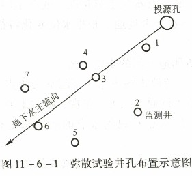 試驗(yàn)在沿地下水流向上布置的試驗(yàn)井組[投源井(注入井)及若干觀測(cè)井]中進(jìn)行,見圖11 -6 -1。
